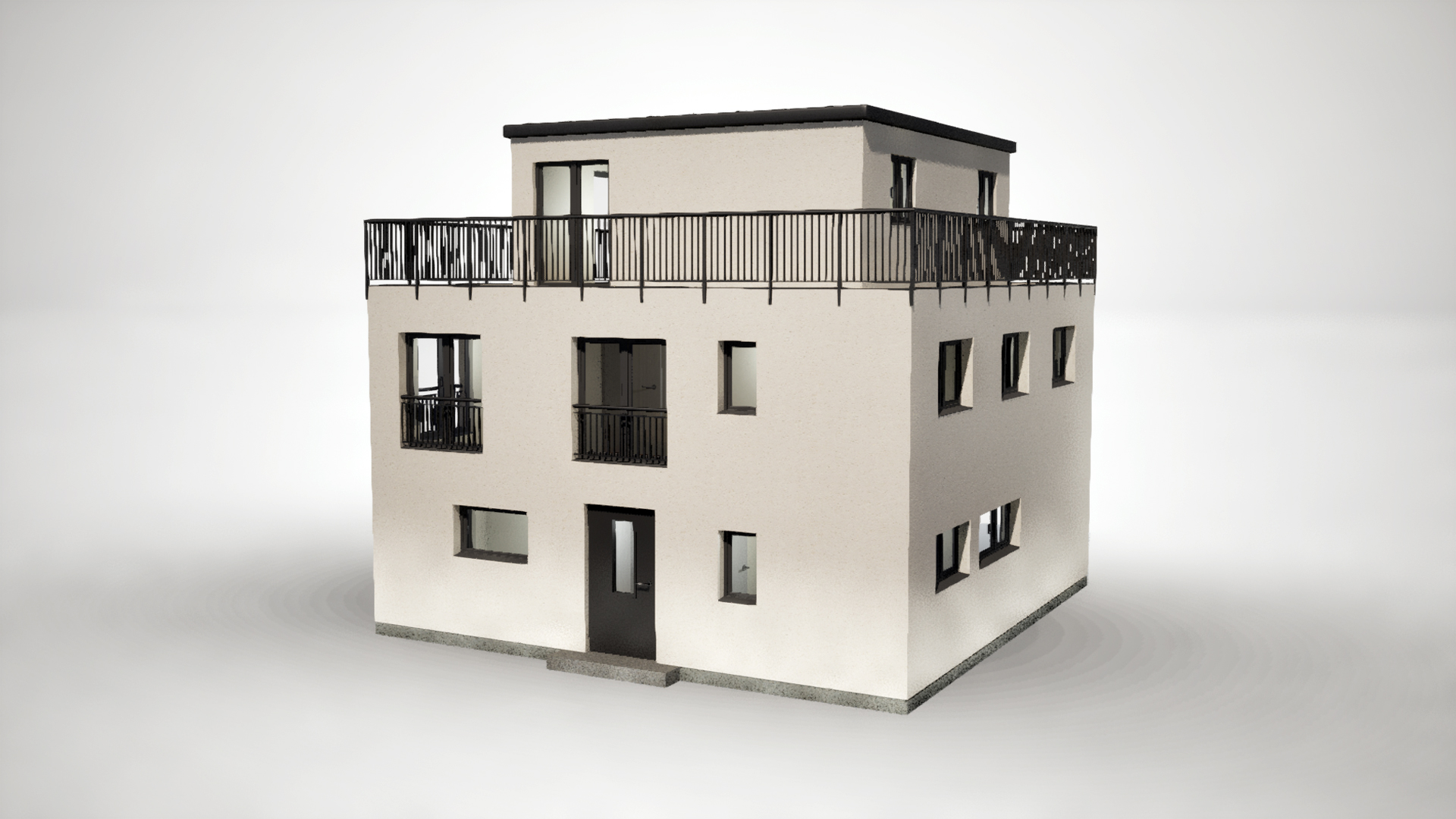 - Erdgeschoss, Obergeschoss, Dachgeschoss, Dach und Büsche sind als Ebenen in 3DsMax eingelegt.